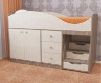 Также в комплексе СТРЕЛКА предусмотрен шкаф со штангой и полками. Из-за небольшой высоты шкафа ребёнку будет удобно доставать и размещать в нём вещи. Ещё одно место для хранения – три выдвижных ящика в центральной части комплекса.