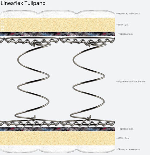 Матрас Tulipano от российского бренда «Линия Флекс» завоевал сердца покупателей по всей стране. И не удивительно, потому что это одна из немногих моделей, обеспечивающая высочайший комфорт по весьма доступной стоимости. Основой выступает уникальная пружинная система «Боннель», не имеющая аналогов во всем мире. Плотность – 120 пружин на квадратный метр.